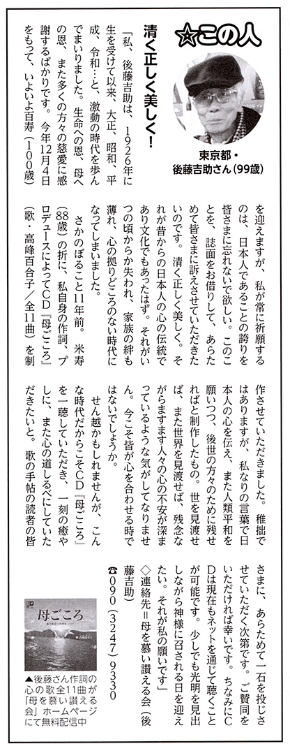 16日(水)夕刊の一面「今日の話題」に『母を思う歌』と題して掲載された。)